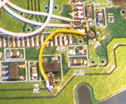 If you want to know the connections, I've made a note of them. Aside from these connections, all you need is an 20MHz crystal connected to the correct pins of the ATMega88. The final thing missing now is a small correction on the PCB of the Xbox-controller: while the resistors etc that were in place for the ST chip will work for the AVR too, the ST was a high-speed device while the AVR is a low-speed one. That means the 1.5K pullup needs to be moved from the USB D+-line to the USB D--line. See the image for how to archieve that: the 1.5K-resistor was above C6 and is moved to between the yellow wire and the black unit next to R4.